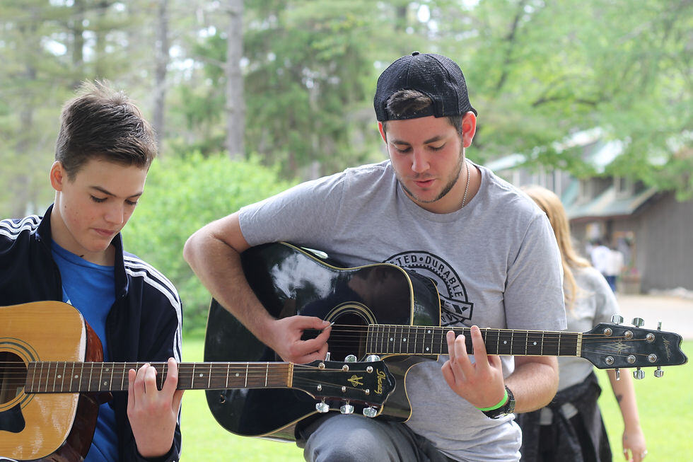 Campers enjoying guitar lessons in the stunning backdrop of outdoor Maine.
